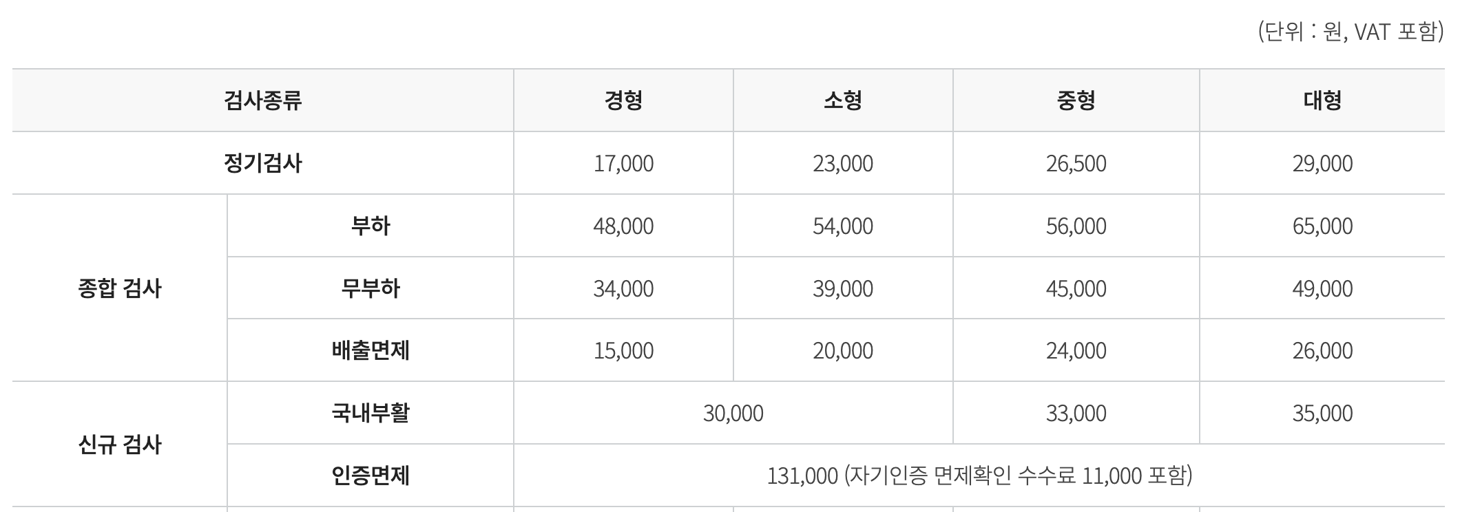 - 검사수수료는 한국교통안전공단 기준 금액이며, 지정정비사업자는 공단과 다를 수 있습니다.