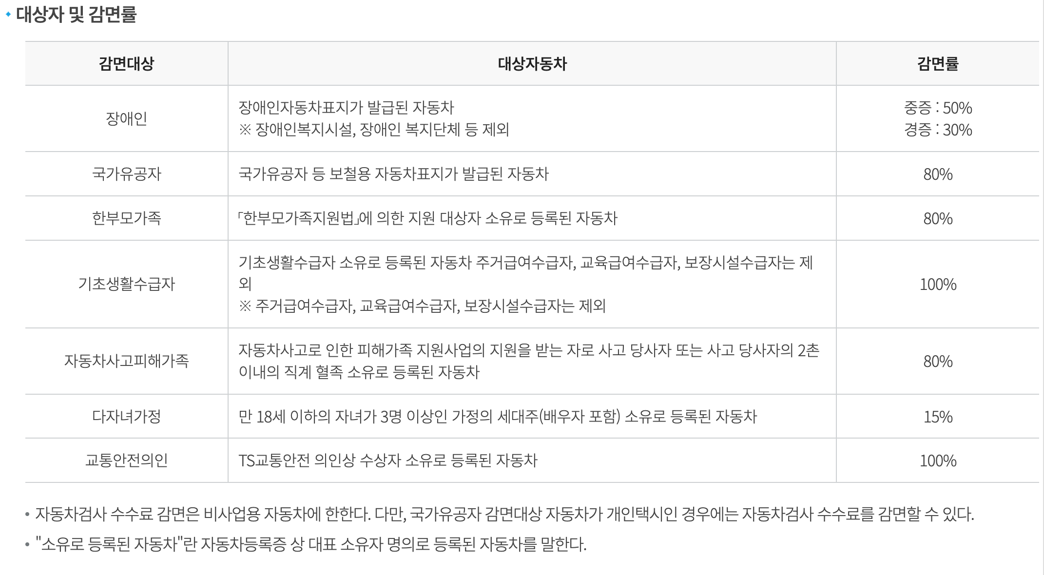 - 한국교통안전공단 자동차검사소에서는 사회공헌활동의 일환으로, 사회적약자를 대상으로 정기검사 및 종합검사시 정상수수료의 일정비율을 감면해드립니다.(기타 감면사항과 합산 또는 중복되어 적용하지 않습니다.)