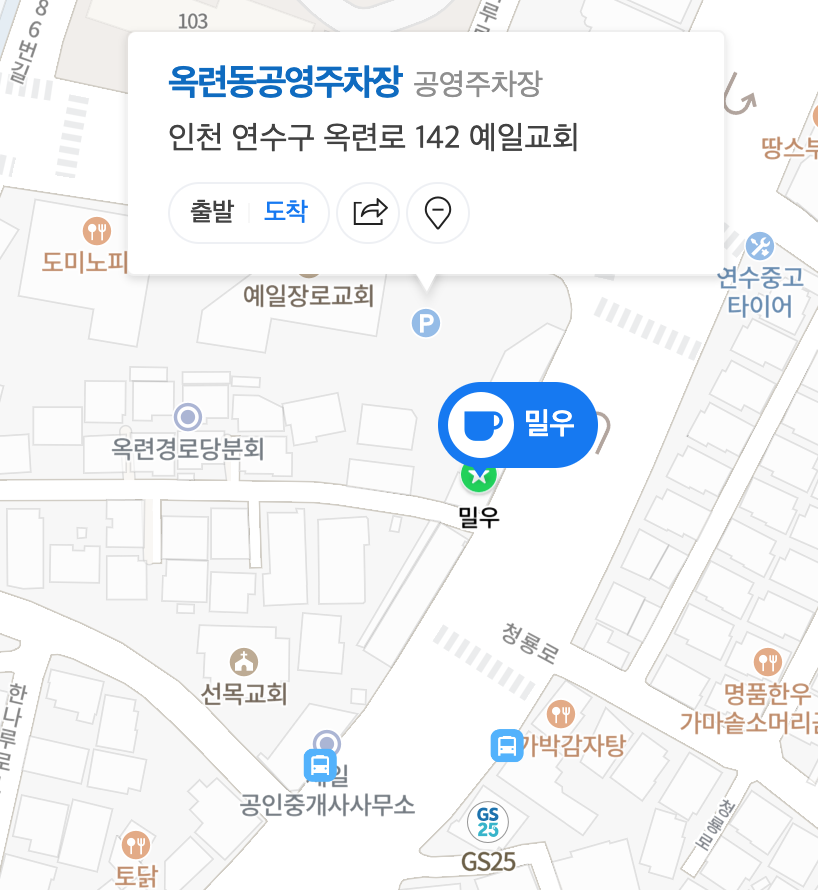 밀우커피는 구 송도(옥련동)에 위치해 있습니다.