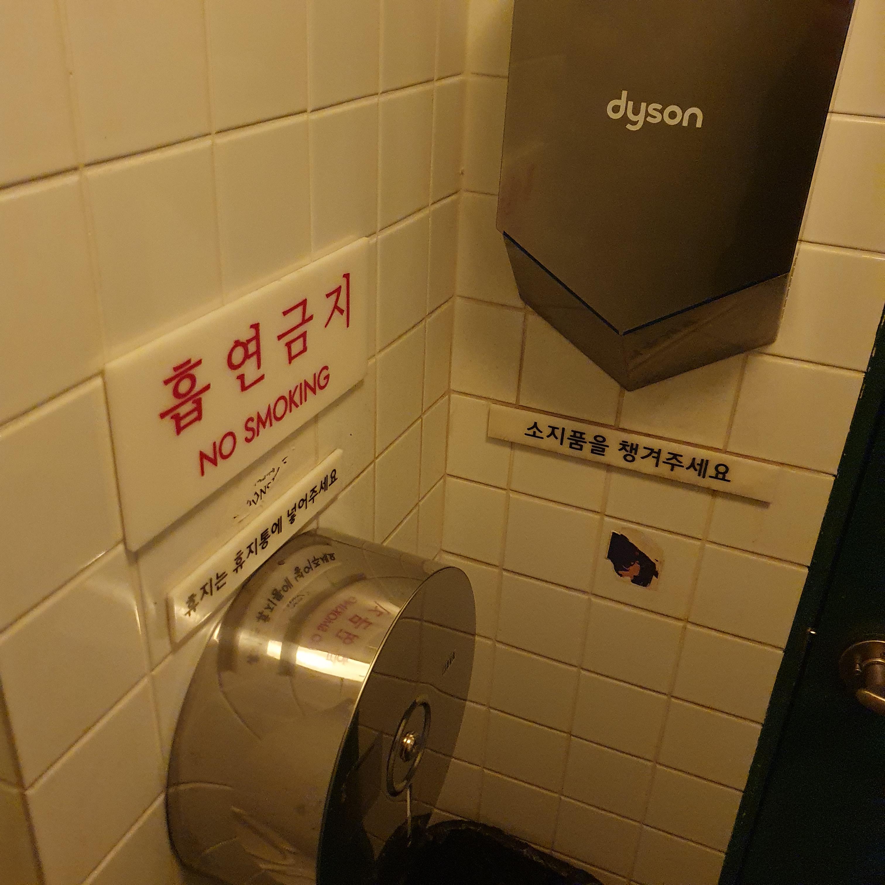 아트몬스터 화장실에는 다이슨 핸드드라이어가 있습니다.