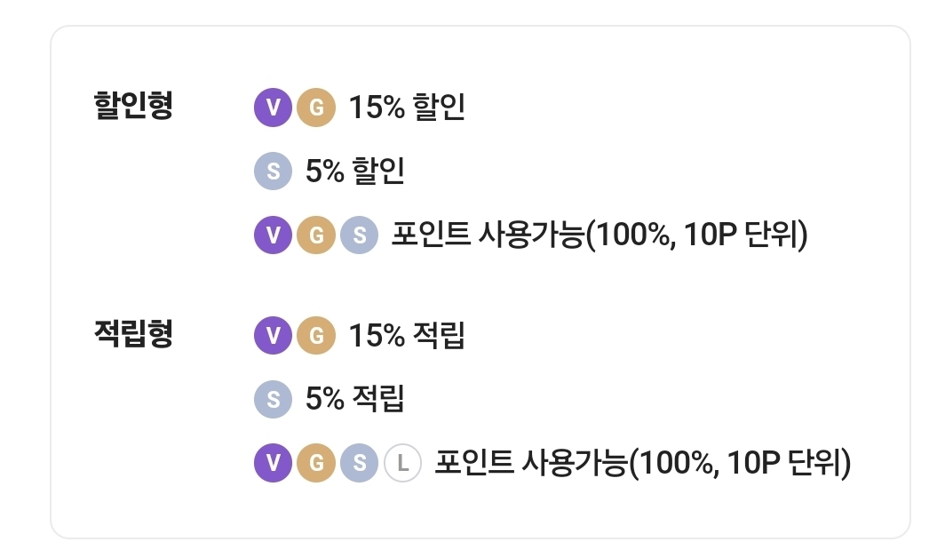 이미지에 나와있는 것 처럼 vip 와 gold 등급은 15%, silver 등급은 5프로 할인이 가능합니다.