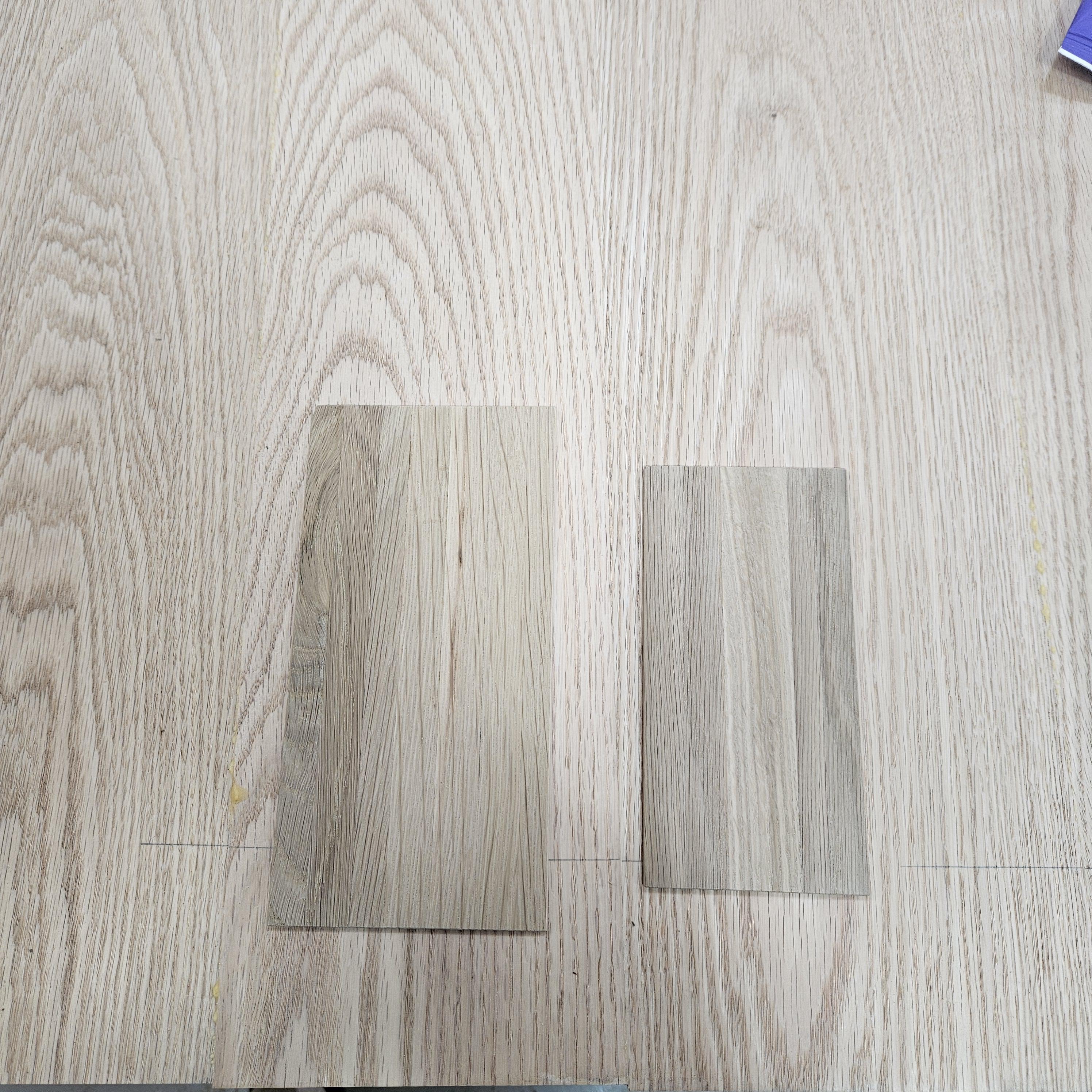 오일로 마감 된 화이트 오크의 조각을 레드오크 상판 위에 올려서 미교도 해주셨는데요, 이렇게 디테일 하게 비교를 해 주셔서 어떻게 만들어 질지 어느정도 가늠이 잡히는 것 같았어요.