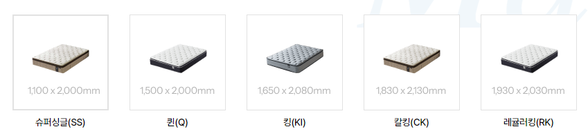 | 규격 | 슈퍼싱글, 퀸, 킹, 칼킹, 레귤러킹 | 슈퍼싱글, 퀸, 킹, 칼킹, 레귤러킹 |