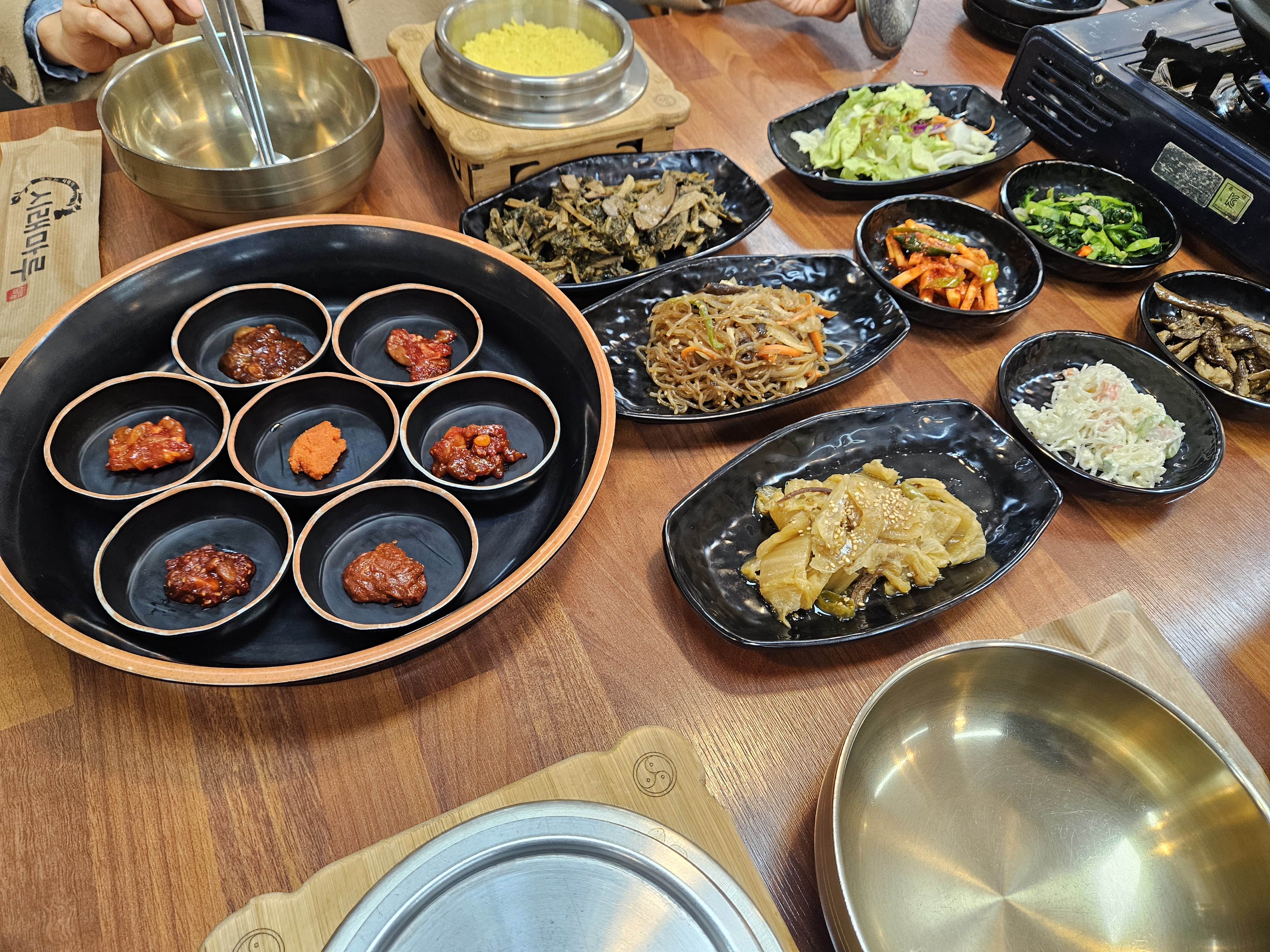 7개의 맛보기 젓갈과 각종 무침들. 그리고 잡채까지요.