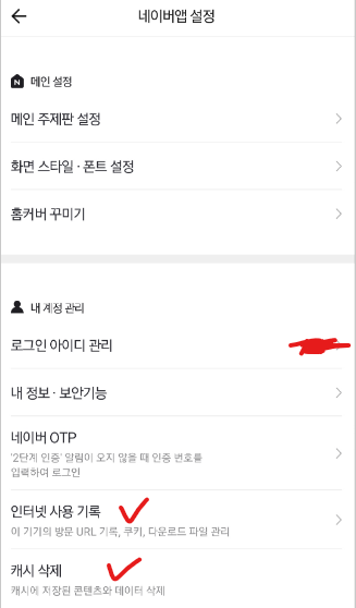 사용기록과 캐시를 모두 삭제하면 네이버 앱이 처음 설치한 것처럼 깨끗해지는데요,