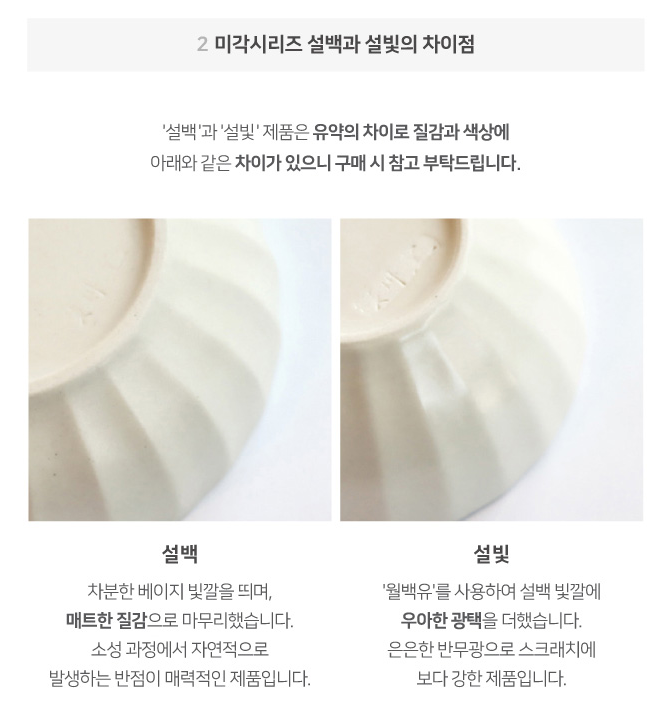 설백은 조금 더 매트한 무광의 느낌이라면 설빛은 반유광 정도로 봐주시면 될 것 같습니다.