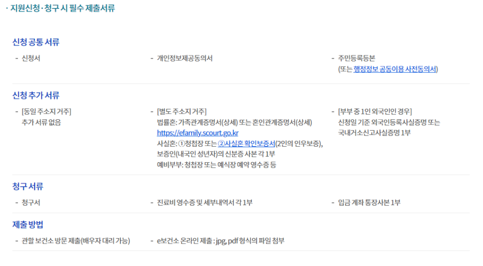 1) 청구서 2) 진료비 영수증 및 세부내역서 각 1부, 입금 계좌 통장사본 1부 이미지