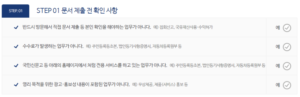 문서 제출 전 확인사항은 모두 "예"를 눌러줍니다.