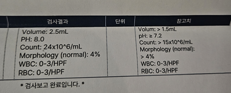 용량, 산도, 정자 수, 형태 등에 대한 검사 결과를 확인할 수 있었습니다.