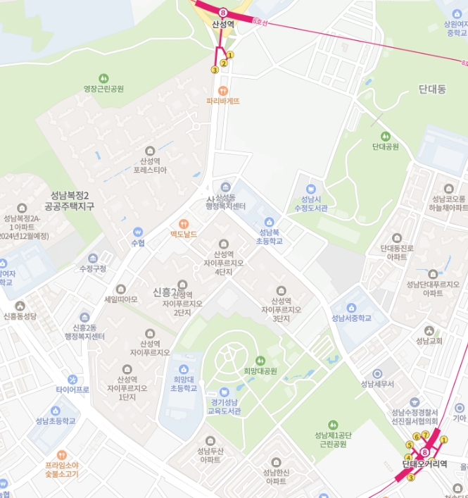 산성역 자이푸르지오는 산성역과 단대오거리 역 사이에 위치해 있으며, 8호선과 연결되어 있어 서울 동남부 지역과의 접근성이 좋습니다. 또한, 지하철 환승 또는 버스를 통해 경기 동남권 접근성도 뛰어난 단지입니다.