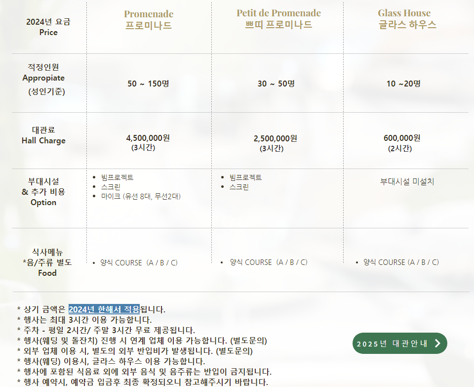 너무 멋진 결혼식을 보고와서 포스팅을 하려다 보니 관련정보를 조금은 알려드리는 게 좋을 것 같아 조사를 좀 해봤습니다. 일반적으로 결혼식장 견적은 직접 예약하고 방문해야 알려주는게 관습인데 세상의 모든 아침은 기본적으로 예식장이 메인이 아어서 그런지 대관료 가이드가 사이트에 올라와 있었습니다.