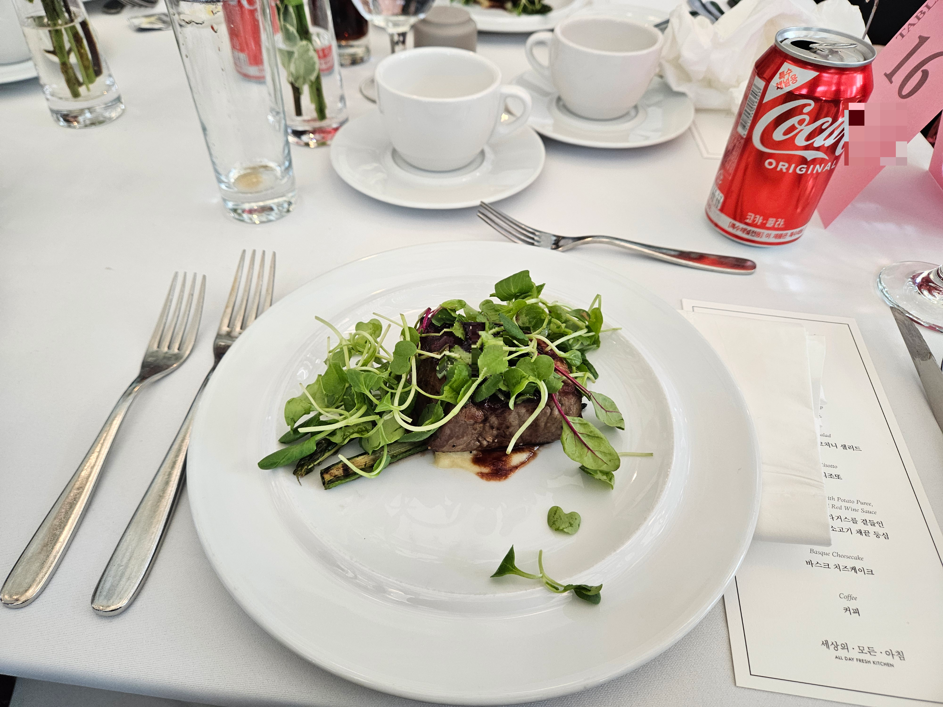 스테이크는 준수했습니다. 꽤나 심부까지 잘 익혀서 나왔는데 질긴 느낌은 전혀 없었어요. 부드럽게 잘 잘리고 입에서도 씹히는 맛이 좋았습니다. 호텔 결혼식 참석하더라도 스테이크는 보통 무난한 편이라 언제부턴가 큰 기대를 안 하게 되는 것 같아요. 사실 결혼식은 밥만 먹으러 오는 것은 아니다 보니 ^^; 그런데 저도 결혼식 식대에 돈을 써보고 나니 어느 정도 퀄리티는 좀 유지해 줬으면 하는 바람이 들기는 합니다.
