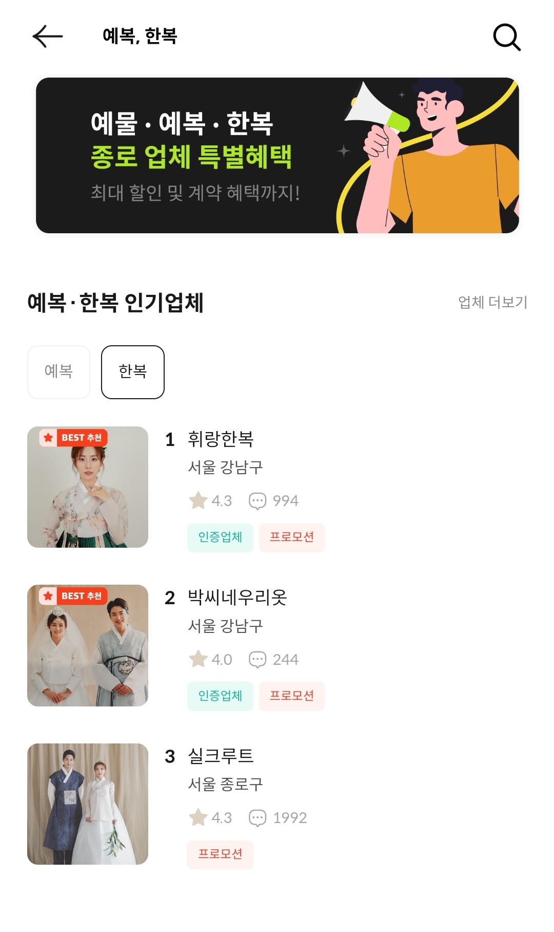 2. 웨딩북에 종로한복업체는 실크루트 뿐