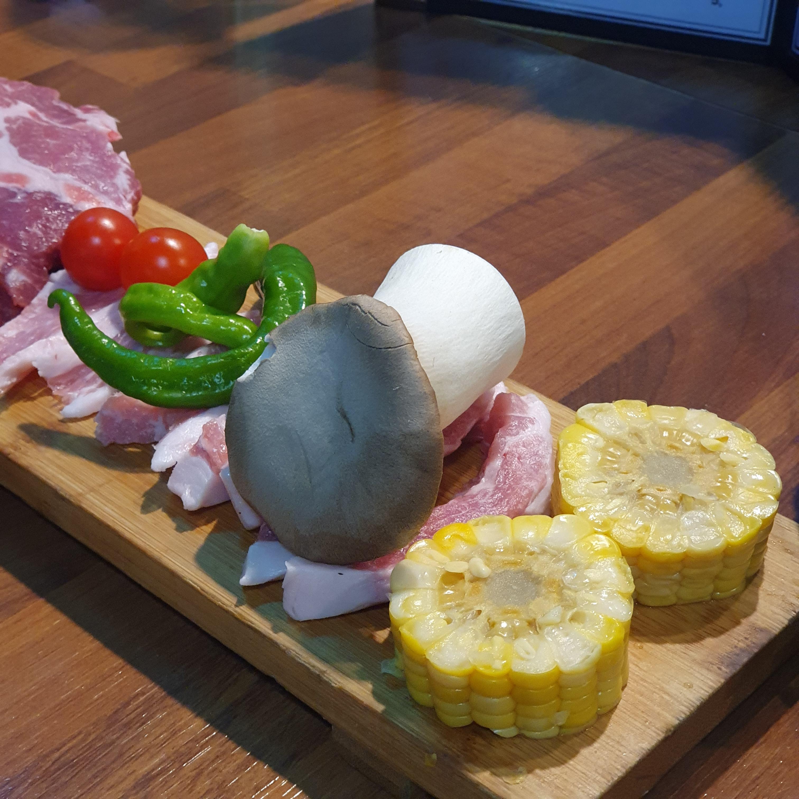 고기 한판에는 여러 야채들도 포함되어 있습니다.