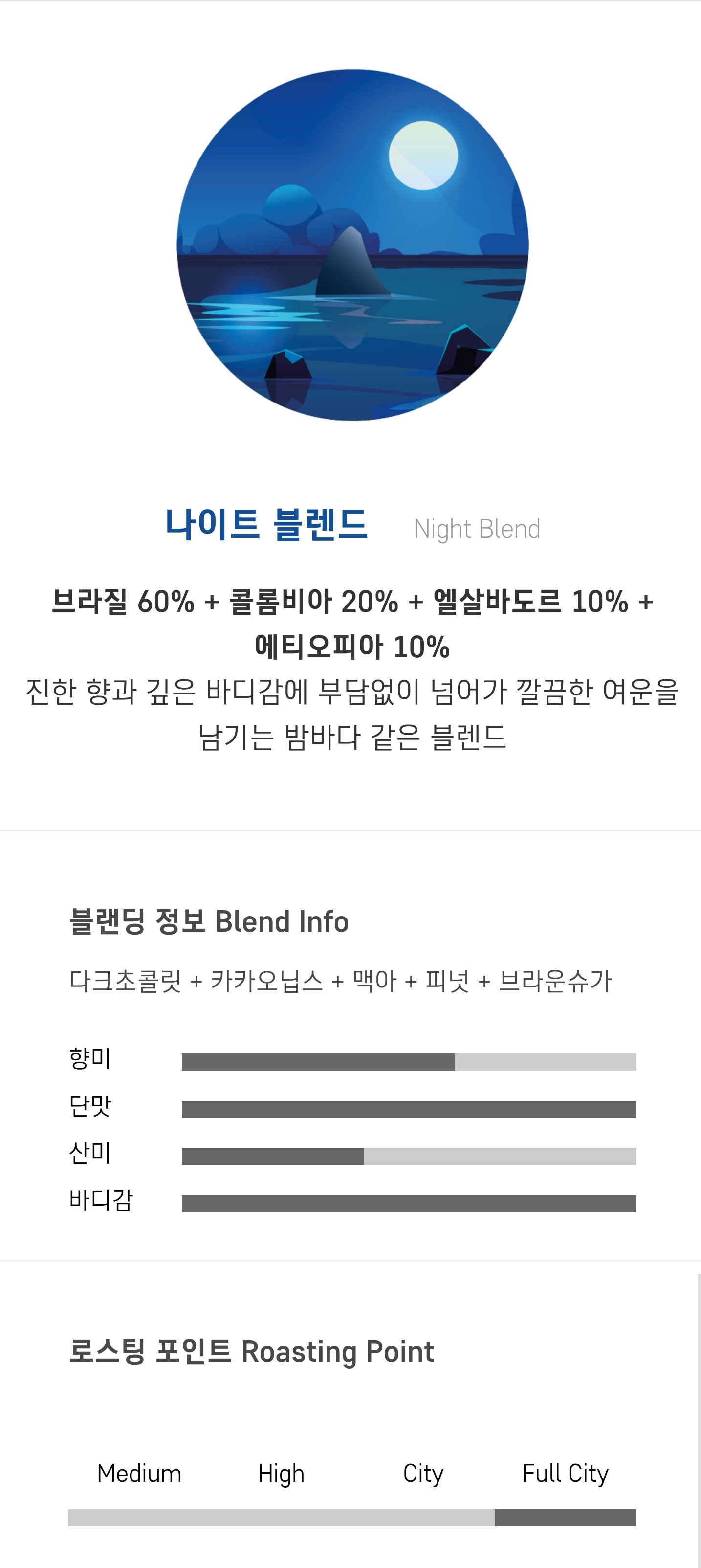 나이트 블랜드는 Full City ( 바삭 구운 로스팅.. ) 로 로스팅 된 원두입니다.