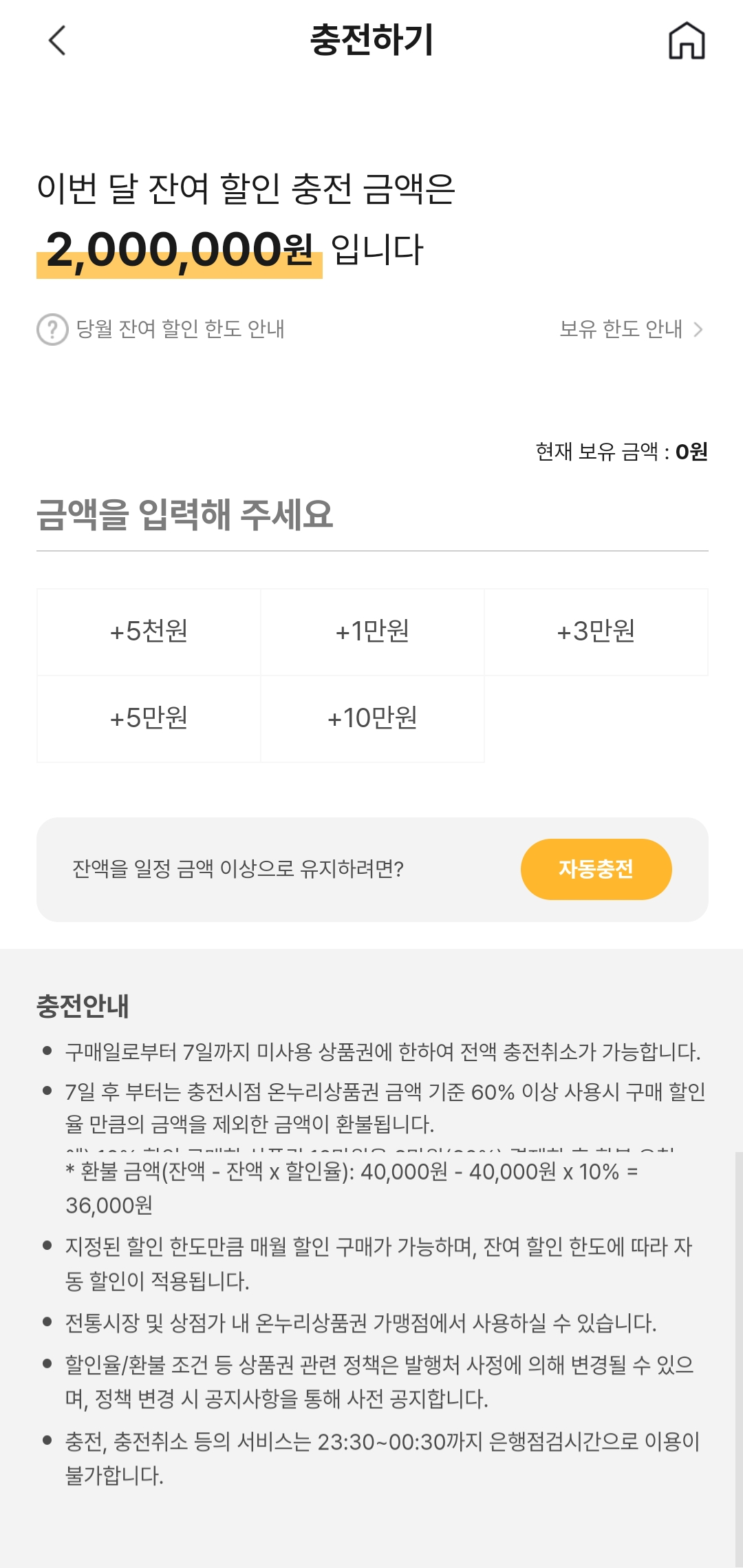 최근에 온누리상품권 충전한도도 월 200만원으로 늘어났고 200만원 이상의 가구를 구매 시 가족끼리 선물하기를 통해 한달 충전금액을 넘겨서 사용도 가능합니다.